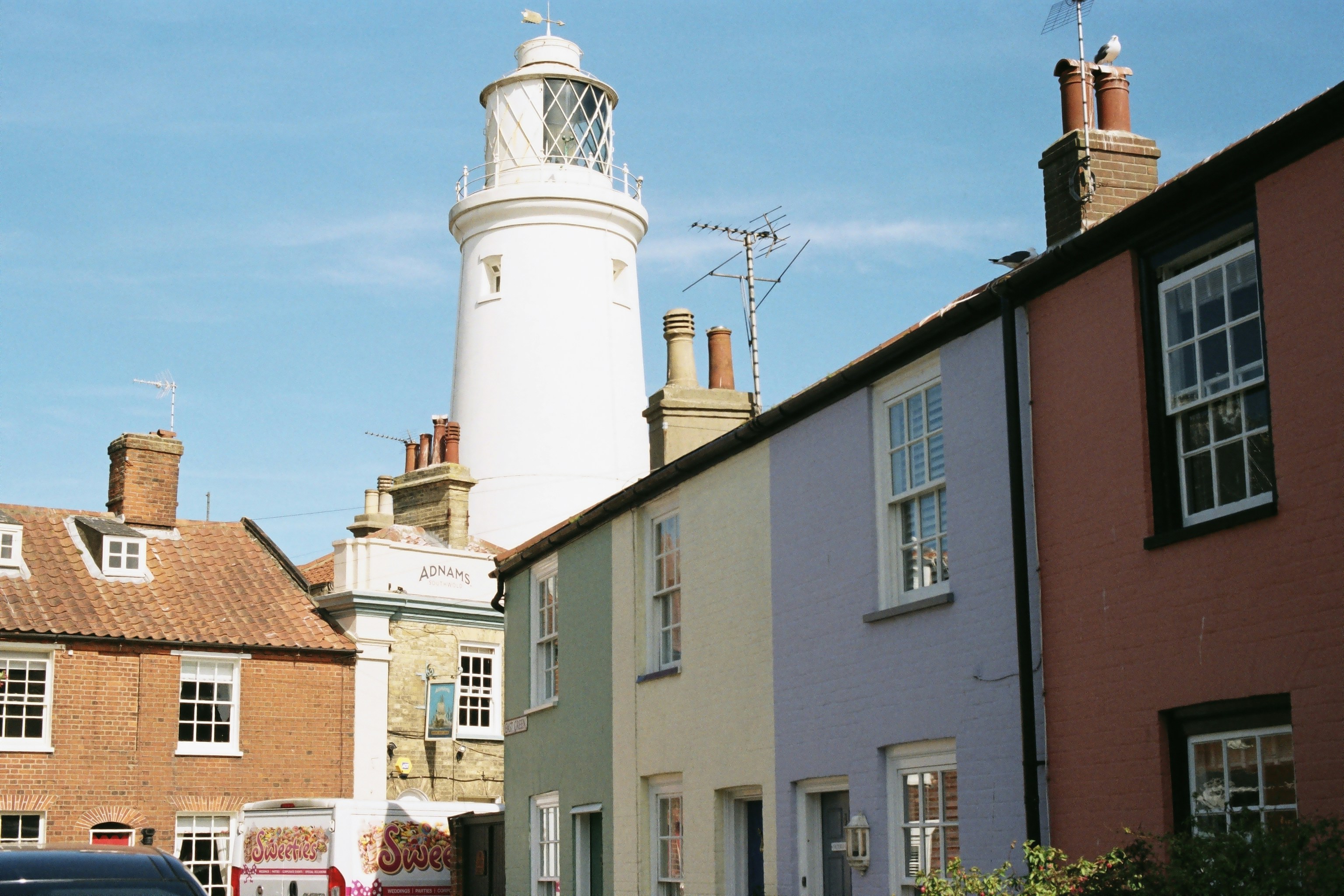 Southwold feels like a seaside postcard made tangible: a long, sandy beach lined with iconic candy‑coloured beach huts, a whitewashed lighthouse standing sentinel over the estuary.